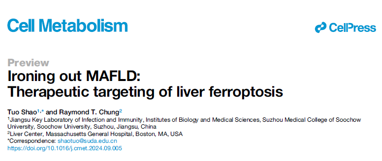 10月1日,苏州大学生物医学研究院邵拓教授受邀联合哈佛大学医学院附属麻省总医院(Massachusetts General Hospital)Raymond T. Chung教授在国际学术期刊《Cell Metabolism》上发表题为“Ironing out MAFLD - therapeutic targeting of liver ferroptosis”的评述性文章,文章对近期发表于《Cell Metabolism》上题为“Integrative clinical and preclinical studies identify FerroTerminator1 as a potent therapeutic drug for MASH”的研究工作进行了导读、评论和展望。