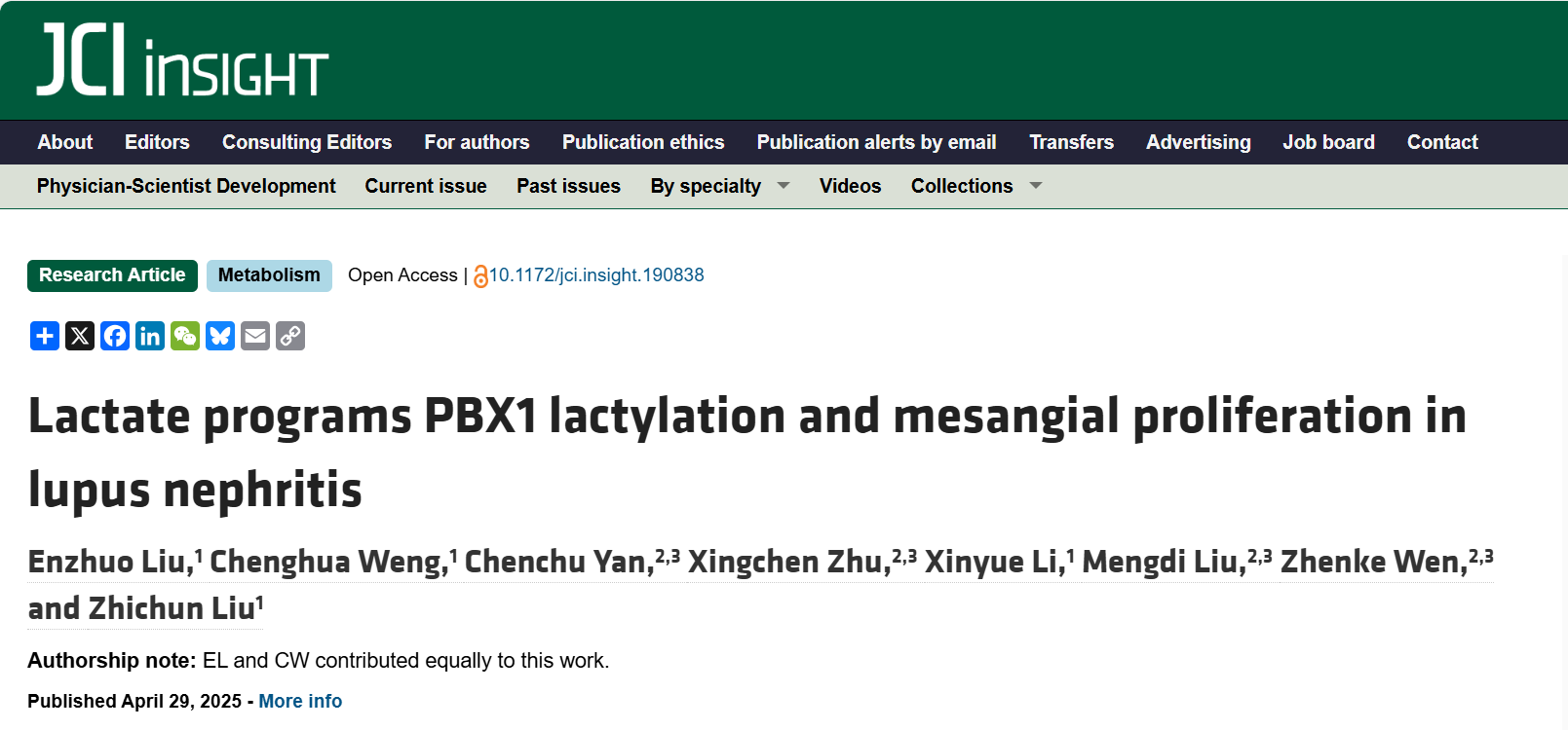 2025年4月29日,《JCI Insight》在线发表了我院温振科教授团队合作研究论文:Lactate programs PBX1 lactylation and mesangial proliferation in lupus nephritis。该研究阐明了狼疮肾炎患者自身DNA-免疫复合物(DNA-ICs)诱导肾小球系膜细胞过度增殖并介导肾脏损伤的新机制。