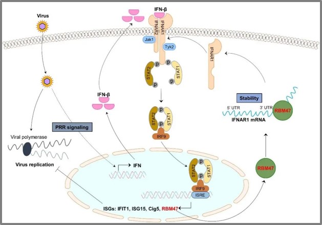 戴建锋教授团队在前期针对登革病毒(Dengue virus, DENV)的研究中发现,RBM47受DENV感染后表达上调,并具有抑制DENV复制的作用。进一步研究发现RBM47是一个ISG,受多种病毒诱导或干扰素刺激上调表达,且具有广谱的抗病毒作用。RBM47对IFN的产生没有明显作用,但对IFN应答元件ISRE的激活及ISGs的表达有显著增强效应。利用RNA结合蛋白免疫沉淀技术(RNA binding protein Immunoprecipitation, RIP),发现RBM47能特异性地结合I型干扰素受体IFNAR1 mRNA的3’-UTR,稳定了该基因的mRNA,继而提高细胞内IFNAR1的蛋白水平,促进病毒感染或干扰素诱导的STAT1/2的磷酸化,增强干扰素刺激基因ISGs的表达,放大宿主的抗病毒作用。