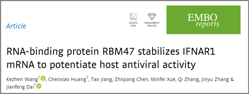 2021年6月23日,苏州大学生物医学研究院戴建锋教授团队在EMBO Reports上发表了题为 RNA-binding protein RBM47 stabilizes IFNAR1 mRNA to potentiate host antiviral activity 的研究成果。该研究首次阐明RBM47是一个ISG,且通过稳定IFNAR1 mRNA来增强宿主的抗病毒效应,提示了以RBM47为代表的RNA结合蛋白在宿主抗病毒天然免疫中发挥着重要作用。
