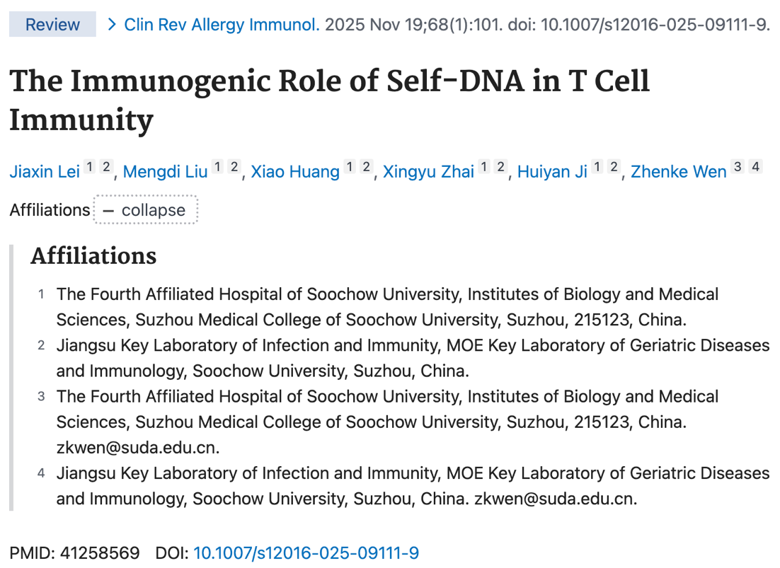 近日,苏州大学生物医学研究院温振科教授团队在免疫学与过敏学领域顶刊《Clinical Reviews in Allergy & Immunology》发表题为《The Immunogenic Role of Self-DNA in T Cell Immunity》的综述,系统性揭示了自身DNA作为“T细胞免疫主动调控者”的角色:既能驱动自身免疫疾病发生,又能影响抗肿瘤免疫应答,为重大慢性疾病的机制研究与治疗开发提供了全新视角。