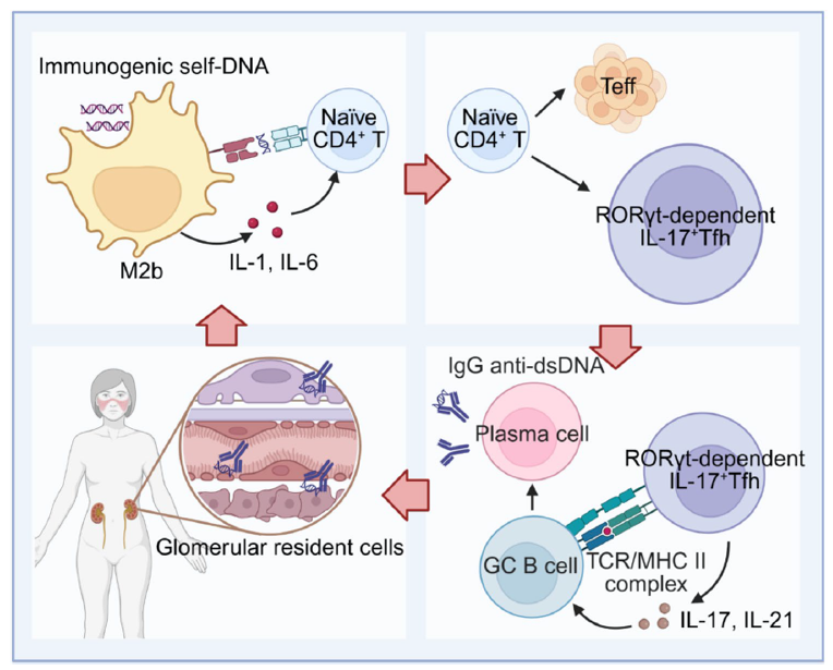 生理状态下,细胞具备高效清除 “逃逸” 自身DNA的机制,避免其异常累积。然而,当细胞死亡、基因组不稳定、线粒体功能失调,加之DNA修复或清除相关的酶缺陷时,大量自身DNA会在胞内或循环中累积。这些累积的自身DNA具备激活免疫应答的能力;但传统研究认为,自身DNA主要通过树突状细胞、巨噬细胞等固有免疫细胞间接影响T细胞,而T细胞如何直接响应自身DNA鲜有报道。
