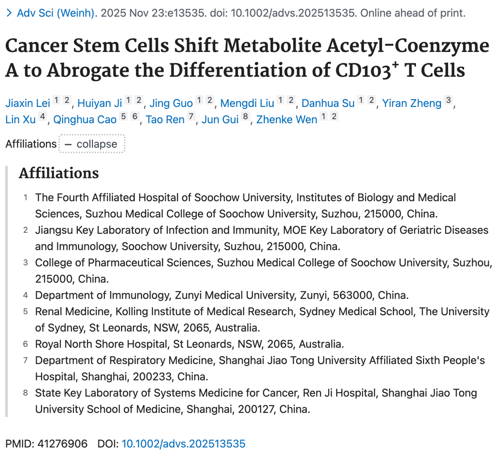近日,苏州大学生物医学研究院温振科教授团队在《Advanced Science》发表合作研究成果:首次揭示肿瘤干细胞的免疫调控功能,解析其抑制CD103+ T细胞分化的核心机制,为突破肿瘤免疫治疗瓶颈提供了全新方向。