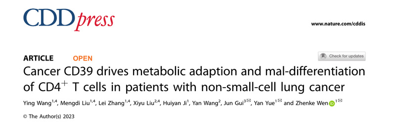 2023年12月8日,苏州大学生物医学研究院温振科教授团队在《Cell Death & Disease》发表题为“Cancer CD39 drives metabolic adaption and mal-differentiation of CD4+ T cells in patients with non-small-cell lung cancer”的研究成果。