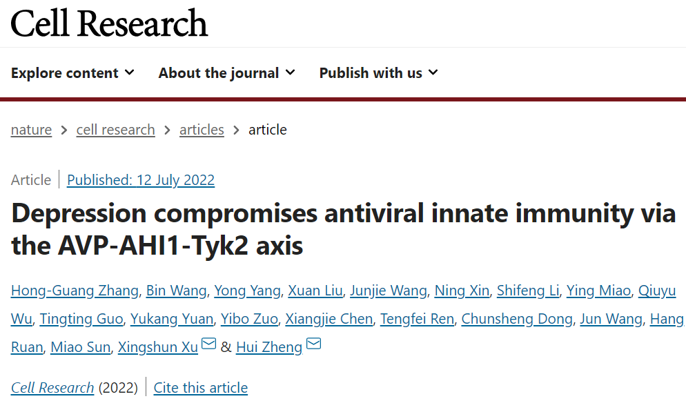 11. Zhang, HG., Wang, B., Yang, Y. et al. Depression compromises antiviral innate immunity via the AVP-AHI1-Tyk2 axis. Cell Res (2022). https://doi.org/10.1038/s41422-022-00689-9.
