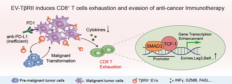 该研究发现了恶性乳腺癌细胞可以通过肿瘤衍生的细胞外囊泡转移活性TGF-β II型受体(TβRII),从而刺激受体细胞中的TGF-β信号。低转移程度的肿瘤细胞摄取含有TβRII的细胞外囊泡会引发上皮间质转化,在小鼠转移模型中显示增强癌症干性并增加转移。EV-TβRII作为货物递送到CD8+ T细胞会诱导SMAD3的激活,SMAD3与TCF1转录因子协同作用使CD8+ T细胞耗竭,导致免疫治疗失败。因此,这一研究结果不仅阐明了乳腺癌细胞促进T细胞耗竭和抑制宿主抗肿瘤免疫的分子机制,而且为改善乳腺癌免疫治疗提供了新的靶点。