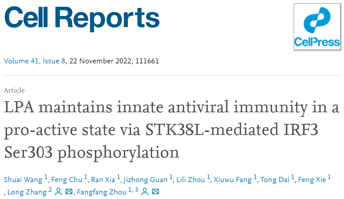 2022年11月22日,来自苏州大学生物医学研究院的周芳芳教授团队和浙江大学生命科学研究院的张龙团队展开合作研究,在《Cell Reports》杂志在线发表了题为:LPA maintains innate antiviral immunity in a pro-active state via STK38L-mediated IRF3 Ser303 phosphorylation的研究论文,该研究深入阐述了多种细胞外因子,包括溶血磷脂酸(LPA)、1-磷酸鞘氨醇(S1P)通过血清反应因子(SRF)诱导丝氨酸/苏氨酸蛋白激酶38样(STK38L)的转录,STK38L继而磷酸化IRF3的S303位点,从而抑制IRF3的泛素化降解,进而将抗病毒免疫反应维持在准备状态。