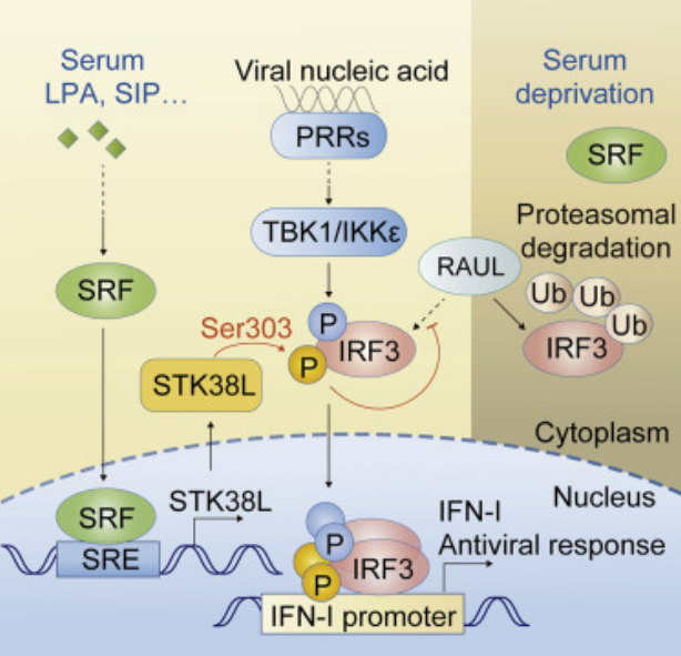 研究人员发现血清剥夺在很大程度上限制了对RNA和DNA病毒的天然抗病毒反应。而血清存在时,由血清反应因子(SRF)诱导的丝氨酸/苏氨酸蛋白激酶38样(STK38L)介导IRF3磷酸化,从而防止IRF3在静息状态(未感染)中通过蛋白酶体降解,以确保在病毒感染状态有足够的IRF3参与激活抗病毒天然免疫。STK38L对IRF3 Ser303的磷酸化是稳定IRF3关键开关。Ser303位点无磷酸化修饰的IRF3倾向被其E3泛素连接酶RAUL泛素化降解。STK38L缺陷小鼠表现出抗病毒天然反应受损,小鼠感染病毒后死亡率和病毒增殖升高。添加LPA、S1P等细胞外因子可通过激活SRF诱导STK38L的表达,进而诱导IRF3的Ser303磷酸化,可拯救由血清剥夺引起的免疫抑制。这些发现将SRF-STK38L-IRF3轴确定为一种新的机制,在未感染时将宿主保持在准备状态,从而确保对病毒的快速免疫反应。
