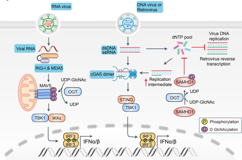 O‐GlcNAcylatio是一种广泛的、高度动态的、可逆的翻译后修饰,可调节蛋白的活性、亚细胞定位和稳定性。O-GlcNAcylation由O-linked N-acetylglucosamine transferase (OGT)和O-GlcNAcase (OGA)这两种循环酶控制,在天然免疫、炎症信号传导和癌症发展中起着关键作用。