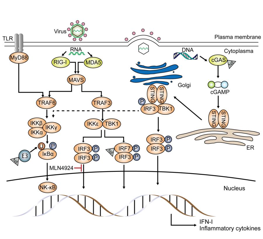 Neddylation是一种泛素样的翻译后蛋白质修饰,它通过活化酶(activating enzyme)、结合酶(conjugating enzyme)和连接酶(ligase)激活神经前体细胞表达的发育下调蛋白8 (NEDD8)。NEDD8于1992年首次从小鼠大脑中分离出来,最初被认为对中枢神经系统的发育和分化有重要作用,近年来,Neddylation被证明在人体免疫系统的各种过程中起关键作用,包括炎症、细菌感染、病毒感染和T细胞功能的调节。此外,还发现NEDD8作用于可影响病毒转录的蛋白质,从而破坏病毒的感染性。